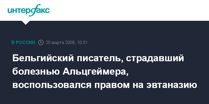 Брюссель. 20 марта. INTERFAX.RU - Известный бельгийский писатель Бельгии Хьюго Клаус, неоднократно выдвигавшийся на Нобелевскую премию, добровольно ушел из жизни в возрасте 78 лет, хотя у него была лишь только первая стадия болезни Альцгеймера. Это первый случай, когда столь известный человек воспользовался правом на эвтаназию, действующем в Бельгии с 2002 года.