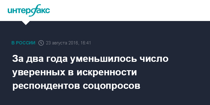 Москва. 23 августа. INTERFAX.RU - За последние два года снизилась доля тех, кто считает, что люди всегда отвечают честно на вопросы интервьюеров - с 27% в 2014 году до 10% сейчас. О том, что респонденты "кривят душой", сказали 69% россиян (50% ранее). Каждый пятый затруднился с ответом (21%).