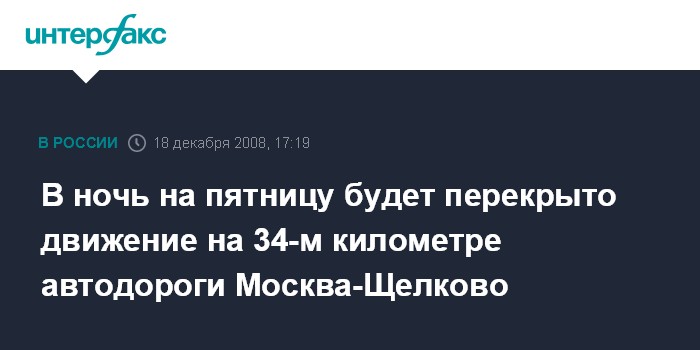 В ночь на пятницу будет перекрыто движение на 34-м километре автодороги Москва-Щелково