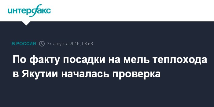 "27 августа 2016 года около 5:00 по местному времени в 170 км к северу от Якутска на реке Лене пассажирский теплоход "Степан Аржаков", принадлежащий местному индивидуальному предпринимателю и следовавший в республиканский центр из поселка Жиганск, сел на мель. По данному факту Восточно-Сибирским следственным управлением на транспорте Следственного комитета Российской Федерации проводится доследственная проверка", - сообщили в ведомстве.