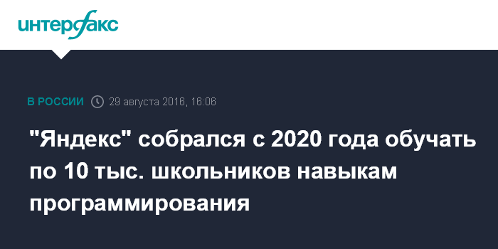 Москва. 29 августа. INTERFAX.RU - "Яндекс" рассчитывает через пять лет ежегодно обучать 10 тыс. школьников навыкам программирования в рамках проекта "Яндекс.Лицей", заявил глава компании в России Александр Шульгин журналистам в Москве.