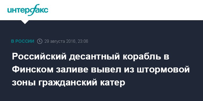 Москва. 29 августа. INTERFAX.RU - Большой десантный корабль "Иван Грен", находившийся на испытаниях в Финском заливе, вывел гражданский катер с людьми из зоны непогоды и сопроводил его в Зеленогорск, сообщил начальник отдела информационного обеспечения пресс-службы ЗВО по Балтийскому флоту капитан первого ранга Роман Мартов.
