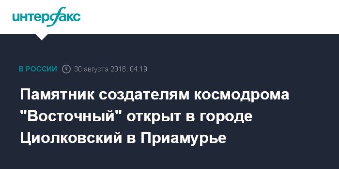 Москва. 30 августа. INTERFAX.RU - Торжественное открытие бронзового монумента создателям космодрома Восточный состоялось во вторник на площади железнодорожного вокзала нового города Циолковский (Амурская область), передает корреспондент агентства "Интерфакс".