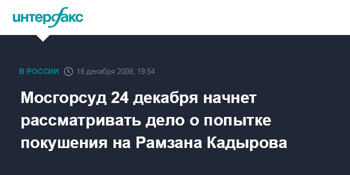 Москва. 18 декабря. INTERFAX.RU - Мосгорсуд 24 декабря приступит к рассмотрению дела о подготовке покушения на президента Чечни Рамзана Кадырова, сообщила "Интерфаксу" пресс-секретарь суда Анна Усачева.