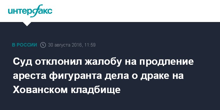 Москва. 30 августа. INTERFAX.RU - Мосгорсуд признал законным продление ареста бывшему руководителю территориального управления №3 ГУП "Ритуал" Юрию Чабуеву по делу о массовой драке на Хованском кладбище, в результате которой погибли три человека.