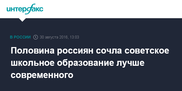 Москва. 30 августа. INTERFAX.RU - Сравнивая качество современного школьного образования с советским, практически половина (47%) россиян в целом отметила, что новая система обучения уступает прежней, сообщили социологи по итогам августовского опроса, проведенного исследовательским холдингом "Ромир".