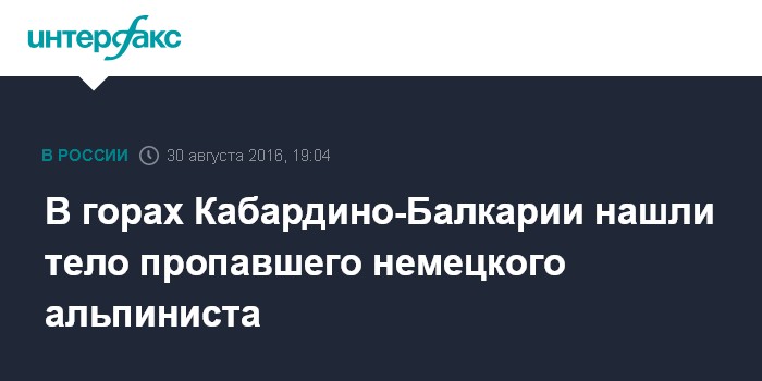 Москва. 30 августа. INTERFAX.RU - Тело альпиниста из Германии, погибшего почти два месяца назад в ущелье Адыр-су в Кабардино-Балкарии, обнаружено во вторник, сообщил агентству "Интерфакс" руководитель пресс-службы ГУ МЧС России по КБР Кантемир Беров.