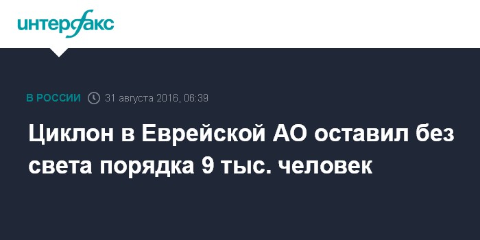 Москва. 31 августа. INTERFAX.RU - Энергетики ликвидируют последствия циклона в Еврейской АО, где из-за сильного ветра нарушилось энергоснабжение девяти населенных пунктов, сообщает пресс-служба областного ГУ МЧС России.