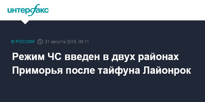 Москва. 31 августа. INTERFAX.RU - Режим чрезвычайной ситуации введен в двух районах Приморья после прохождения тайфуна Лайонрок на территории края.