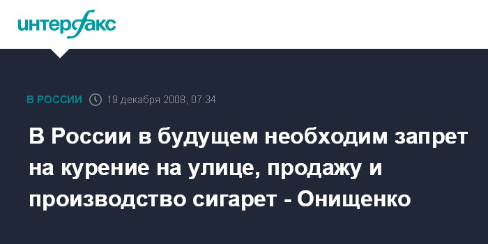"Уже сегодня следует ставить вопрос о том, что на территории России необходимо запретить употребление, и не только на улице, продажу и производство сигарет", - заявил Г.Онищенко "Интерфаксу" в пятницу.