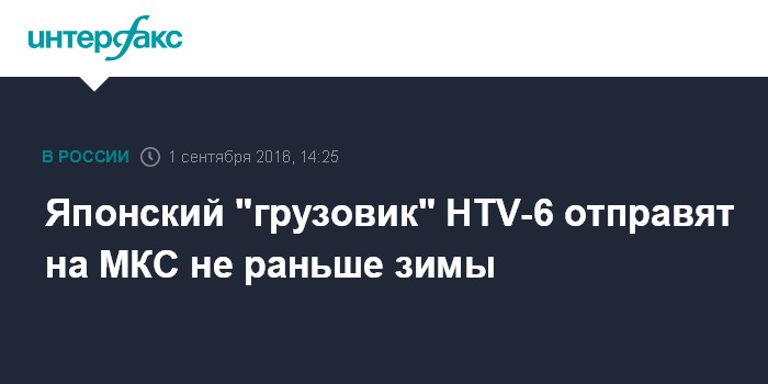 Москва. 1 сентября. INTERFAX.RU - Запуск японского грузового корабля HTV-6 к Международной космической станции (МКС) откладывается как минимум до декабря, сообщил "Интерфаксу" источник в ракетно-космической отрасли.