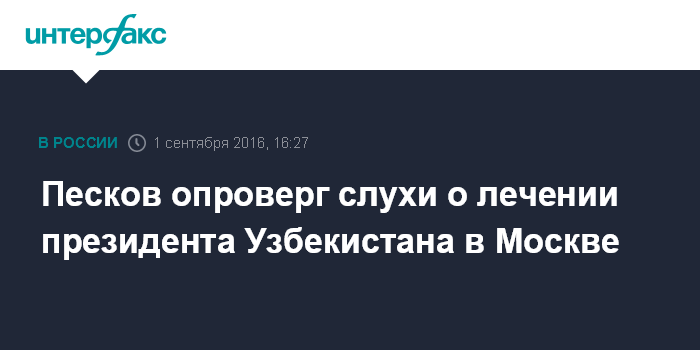 Москва. 1 сентября. INTERFAX.RU - Пресс-секретарь президента Дмитрий Песков опроверг слухи о том, что узбекского лидера Ислама Каримова доставили для лечения в Москву после кровоизлияния в мозг.