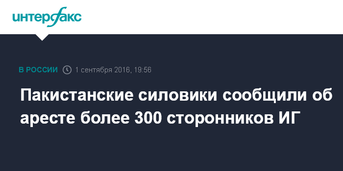 Москва. 1 сентября. INTERFAX.RU - Власти Пакистана арестовали 309 сторонников террористической группировки "Исламское государство" (ИГ, запрещена в РФ), сообщили в четверг западные СМИ со ссылкой на Минобороны страны.
