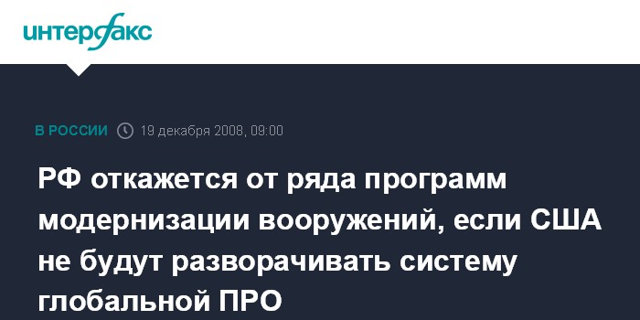 РФ откажется от ряда программ модернизации вооружений, если США не будут разворачивать систему глобальной ПРО