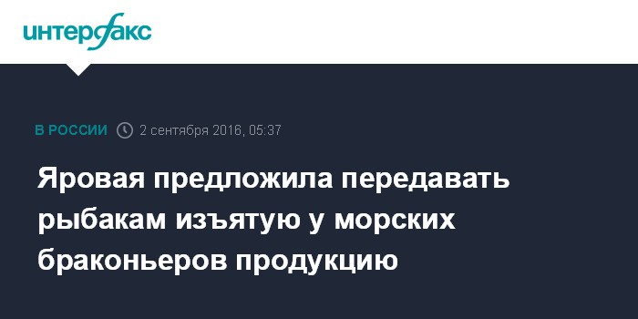Москва. 2 сентября. INTERFAX.RU - Глава комитета Госдумы по безопасности и противодействию коррупции Ирина Яровая предложила передавать изъятую у браконьеров продукцию легальным рыбакам.