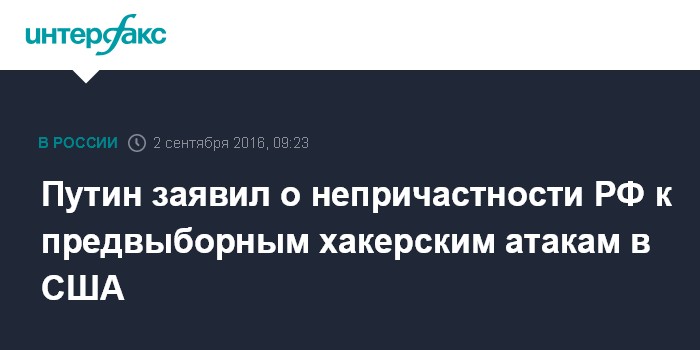Москва. 2 сентября. INTERFAX.RU - Президент РФ Владимир Путин завил, что правительство России не имеет отношения к хакерским атакам на демократическую партию США, в результате которых были опубликованы тысячи электронных документов.