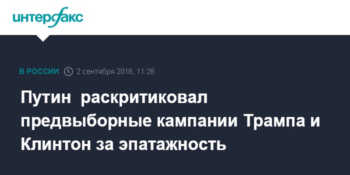 Москва. 2 сентября. INTERFAX.RU - Президент РФ Владимир Путин считает, что Дональд Трамп и Хиллари Клинтон подают "не самый лучший пример" ведения избирательной кампании.