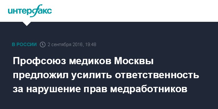 "Вопиющая ситуация с участившимися случаями нападений на медиков не может оставаться без внимания. Количество случаев противоправных действий в адрес медицинских работников растет не только в Москве, но и по всей России. Мы считаем, что ситуация должна измениться и выступаем с инициативой законодательного закрепления основ по защите прав и интересов медицинских работников, их жизни и здоровья», - сказал председатель Профсоюза медицинских работников Москвы Сергей Ремизов "Интерфаксу" в пятницу.