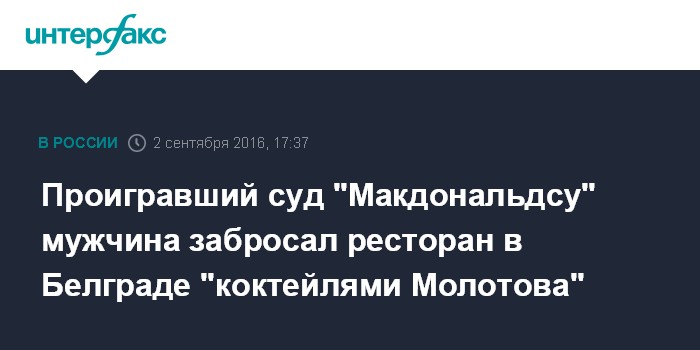 Москва. 2 сентября. INTERFAX.RU - Полиция в пятницу арестовала мужчину, который забросал ресторан "Макдональдс" в Белграде бутылками с зажигательной смесью, сообщает сербский телерадиоканал РТС.