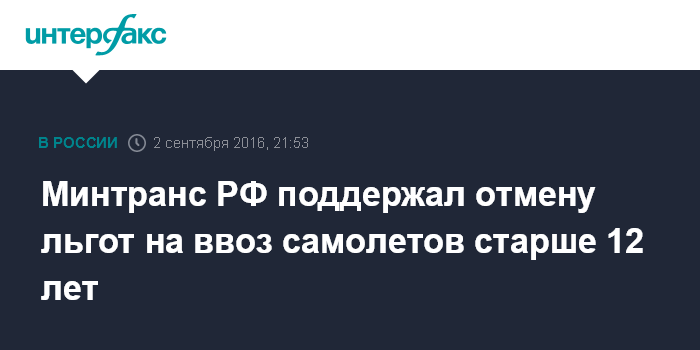 Москва. 2 сентября. INTERFAX.RU - Минтранс РФ поддержал инициативу по отмене льгот на ввозимые в РФ самолеты старше 12 лет, заявил глава министерства Максим Соколов в интервью телеканалу "Россия 24".