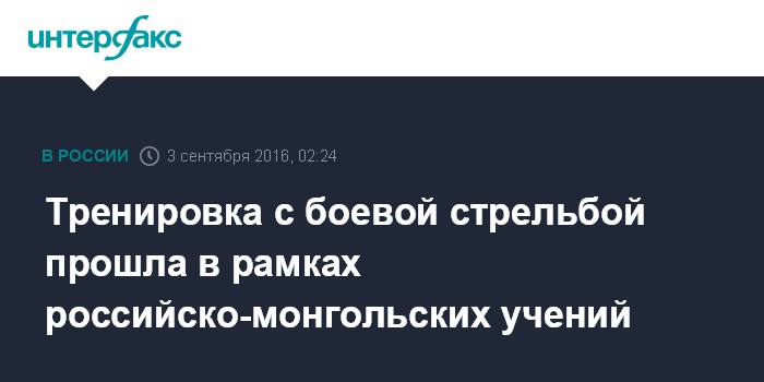 Москва. 3 сентября. INTERFAX.RU - Первая совместная тренировка с боевой стрельбой проведена на полигоне "Бурдуны" в рамках совместного российско-монгольского военного учения "Селенга-2016", сообщил начальник пресс-службы Восточного военного округа (ВВО) полковник Александр Гордеев.