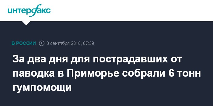 Москва. 3 сентября. INTERFAX.RU - Жители Приморья к вечеру пятницы собрали шесть тонн гуманитарного груза для земляков, пострадавших от паводка, вызванного тайфуном Лайонрок, сообщает пресс-служба администрации края.