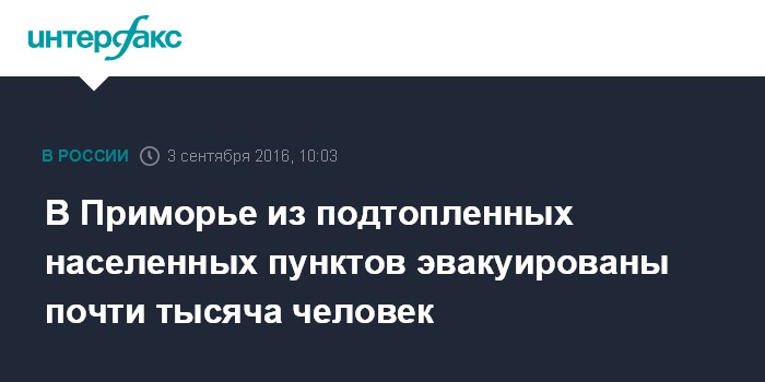 Москва. 3 сентября. INTERFAX.RU - Спасатели продолжают эвакуировать жителей Приморья из пострадавших от тайфуна населенных пунктов, сообщает в субботу пресс-служба администрации края.