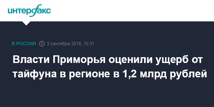 Москва. 3 сентября. INTERFAX.RU - Ущерб, нанесенный наводнением Приморскому краю, оценивается в 1,2 млрд рублей, сообщил вице-губернатор Приморского края Александр Лось.