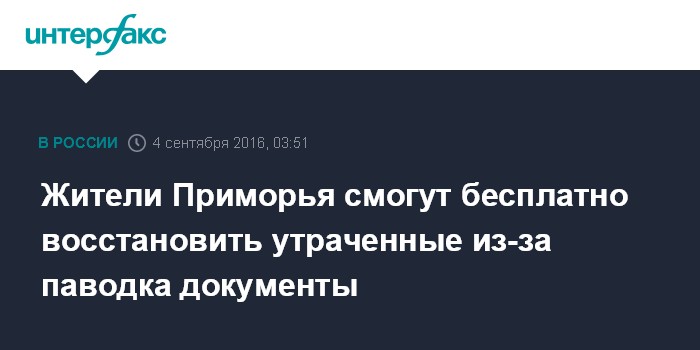Москва. 4 сентября. INTERFAX.RU - Жители Приморья, чьи документы пострадали во время тайфуна Лайонрок, смогут восстановить их бесплатно, сообщила администрация края.