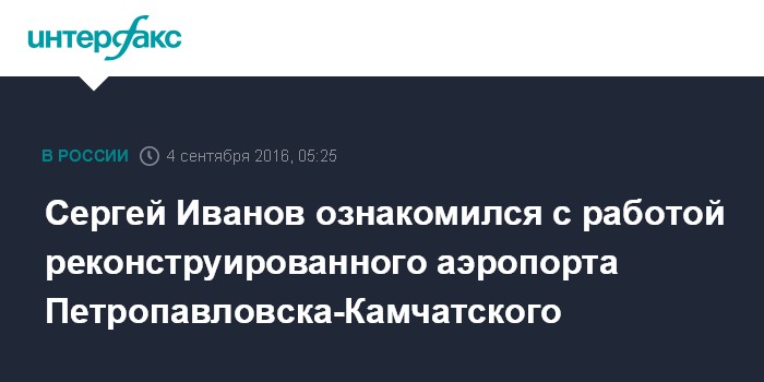 Москва. 4 сентября. INTERFAX.RU - Спецпредставитель президента РФ по вопросам природоохранной деятельности, экологии и транспорта Сергей Иванов ознакомился сегодня с работой аэропорта Петропавловска-Камчатского "Елизово", который прошел масштабную реконструкцию.