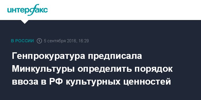 Москва. 5 сентября. INTERFAX.RU - Генеральная прокуратура России потребовала от министерства культуры РФ привести в соответствие с законом порядок ввоза физическими лицами в Россию культурных ценностей для личного пользования.