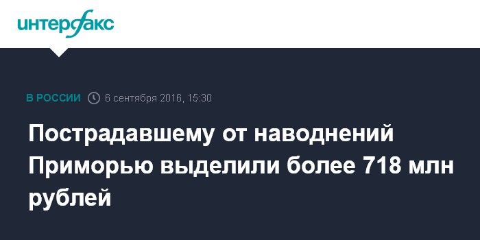 Москва. 6 сентября. INTERFAX.RU - Премьер-министр РФ Дмитрий Медведев подписал распоряжение о выделении пострадавшему от наводнения Приморью 718,5 млн рублей, сообщается во вторник на интернет-портале правовой информации.