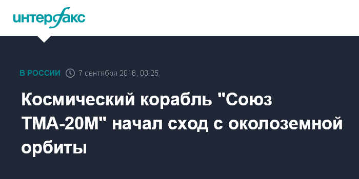 Москва. 7 сентября. INTERFAX.RU - Космический корабль "Союз ТМА-20М" с тремя членами экипажа, несколько часов назад покинувший причал Международной космической станции (МКС), включил двигатель для торможения и схода с околоземной орбиты.