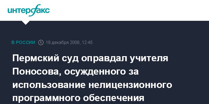 Москва. 19 декабря. INTERFAX.RU - Пермский краевой суд в пятницу рассмотрел надзорную жалобу бывшего директора Сепычевской средней школы (Верещагинский район, Пермский край) Александра Поносова, осужденного за использование нелицензионного программного обеспечения.