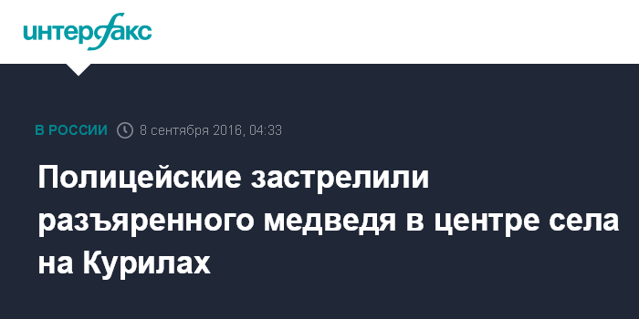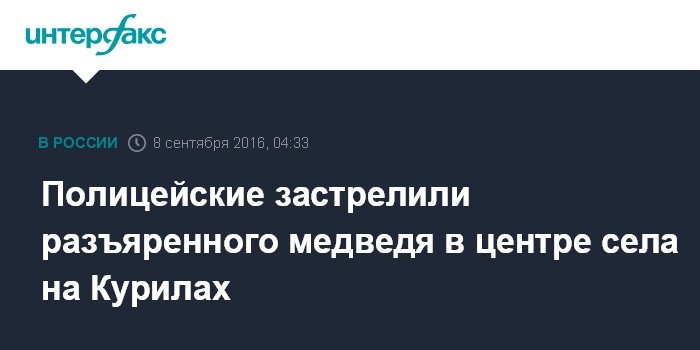 Москва. 8 сентября. INTERFAX.RU - Медведь вышел днем в среду в центр села Рейдово на острове Итуруп (средние Курилы), жители села обратились за помощью к полицейским, сообщает пресс-служба УМВД региона.