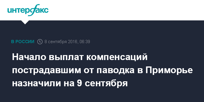 Москва. 8 сентября. INTERFAX.RU - Власти Приморья планируют начать выплаты компенсаций из федерального бюджета пострадавшим от наводнения жителям уже с 9 сентября.
