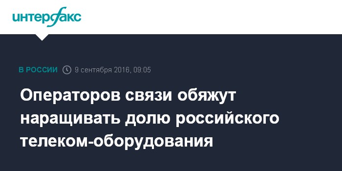 Москва. 9 сентября. INTERFAX.RU - Российских операторов связи предложили обязать к 2020 году довести долю телекоммуникационного оборудования российского происхождения (ТОРП) в своих сетях до 85%, сообщает газета "Коммерсант " со ссылкой на проект "дорожной карты" по импортозамещению телеком-оборудования.