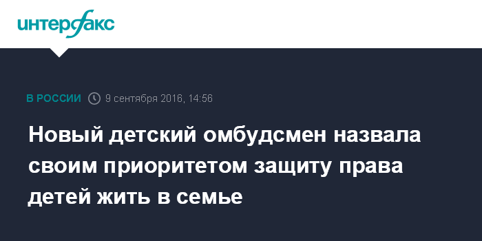 Москва. 9 сентября. INTERFAX.RU - Новый уполномоченный при президенте РФ по правам ребенка Анна Кузнецова в своей работе намерена в первую очередь отстаивать право несовершеннолетнего жить и воспитываться в семье.