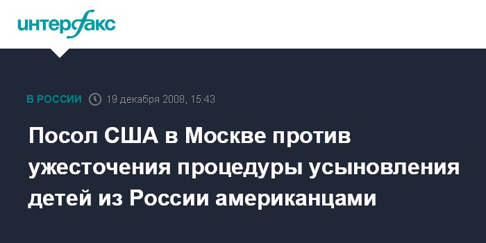 Москва. 19 декабря. INTERFAX.RU - Посол США в России Джон Байерли с пониманием относится к тем чувствам, которые вызвал в России оправдательный приговор американского суда отцу усыновленного в России ребенка, погибшего от удушья, но считает неверными призывы ужесточить процедуру усыновления российских детей американскими гражданами.