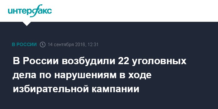 Москва. 14 сентября. INTERFAX.RU - МВД РФ возбудило 22 уголовных дела по нарушениям во время избирательной кампании на территории России, сообщил в среду первый заместитель министра Александр Горовой.