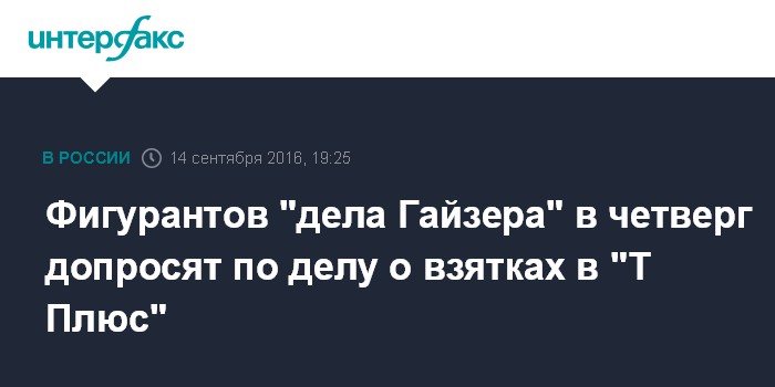 Москва. 14 сентября. INTERFAX.RU - Следствие намерено допросить фигурантов "дела Гайзера" в качестве свидетелей по делу в отношении экс-руководителей "Т Плюс" (входит в группу "Ренова"), обвиняемых во взяточничестве, сообщил "Интерфаксу" источник, знакомый с ситуацией.