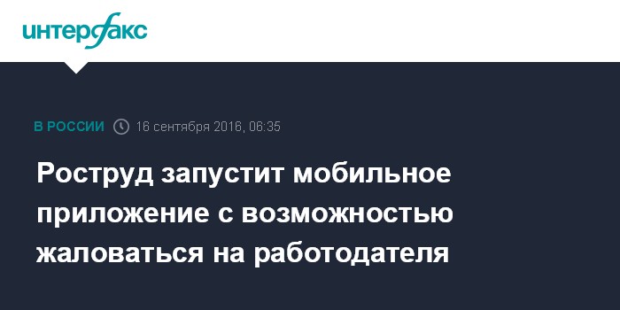 Москва. 16 сентября. INTERFAX.RU - Федеральная служба по труду и занятости (Роструд) к концу года представит мобильное приложение, с помощью которого можно будет в режиме онлайн пожаловаться на нарушения трудового законодательства, пишет газета "Известия" в пятницу.