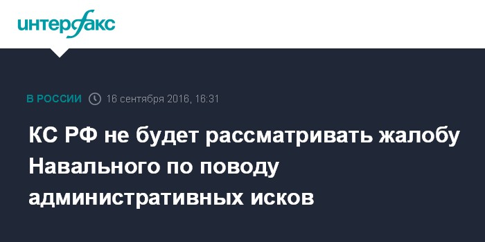 Москва. 16 сентября. INTERFAX.RU - Конституционный суд РФ не нашел оснований для принятия к рассмотрению жалобы оппозиционера Алексея Навального на норму Кодекса административного судопроизводства, поданную после отказа московского суда рассмотреть его иск к президенту России.