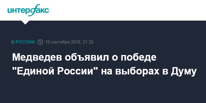 Москва. 18 сентября. INTERFAX.RU - Премьер-министр РФ Дмитрий Медведев объявил о победе "Единой России" на выборах в Госдуму.