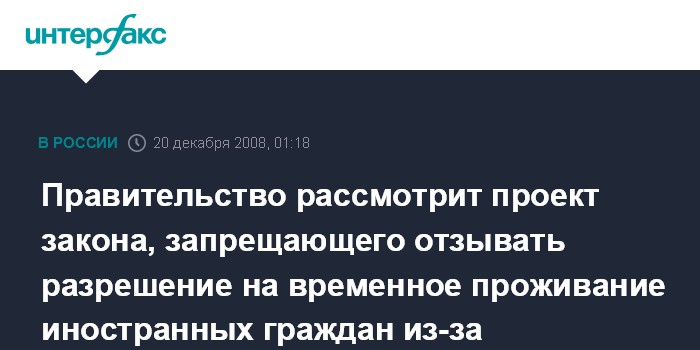 Москва. 20 декабря. ИНТЕРФАКС - Правительство РФ рассмотрит проект закона, отменяющего отзыв временного разрешения на проживание иностранных граждан в случае сокращения квоты на иностранную рабочую силу.