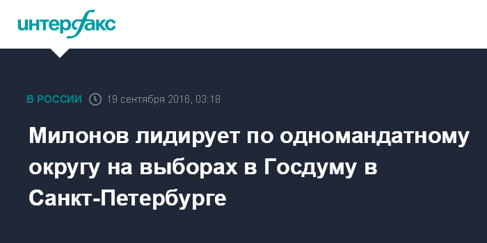 Москва. 19 сентября. INTERFAX.RU - Депутат петербургского парламента Виталий Милонов набирает более 30% голосов, лидируя в Южном одномандатном округе Санкт-Петербурга на выборах в Госдуму. Как передает корреспондент "Интерфакса", об этом свидетельствуют соответствующие данные на электронном информационном стенде в Центризбиркоме.