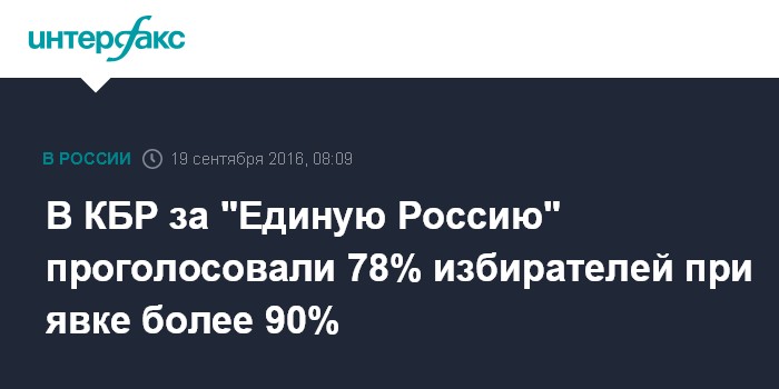 Москва. 19 сентября. INTERFAX.RU - Явка на выборах в Кабардино-Балкарии превысила 90%, за "Единую Россию" отдали голоса 77,71% проголосовавших, сообщил "Интерфаксу" в понедельник заместитель председателя избиркома КБР Сергей Евтушенко.