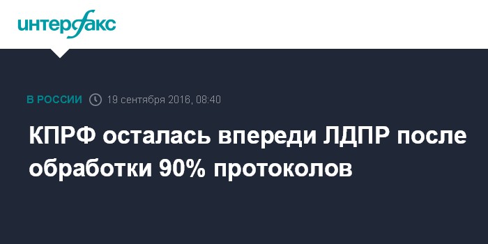 Москва. 19 сентября. INTERFAX.RU - Партия КПРФ пока выигрывает у ЛДПР борьбу за второе место на выборах в Госдуму по федеральному округу с 13,54%, передает корреспондент "Интерфакса" из информационного центра ЦИК России. Согласно данным Центризбиркома после обработки 90% протоколов, у ЛДПР, которая идет третьей, 13,28%.
