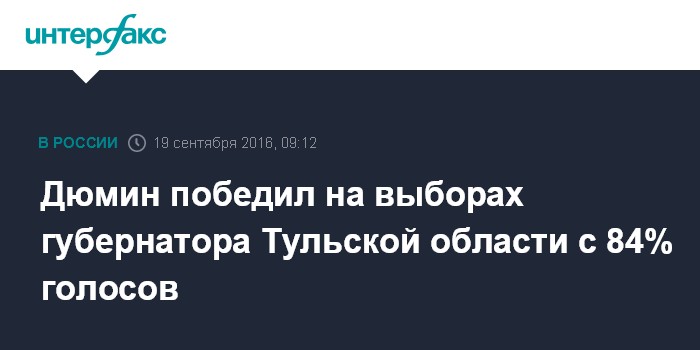Москва. 19 сентября. INTERFAX.RU - На выборах главы Тульской области, по итогам обработки 100% протоколов, победил Алексей Дюмин, сообщил журналистам в понедельник председатель областной избирательной комиссии Сергей Костенко.