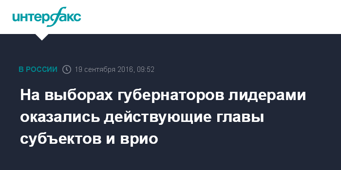 Москва. 19 сентября. INTERFAX.RU - На выборах губернаторов, согласно предварительным данным, лидируют действующие главы субъектов РФ или врио.